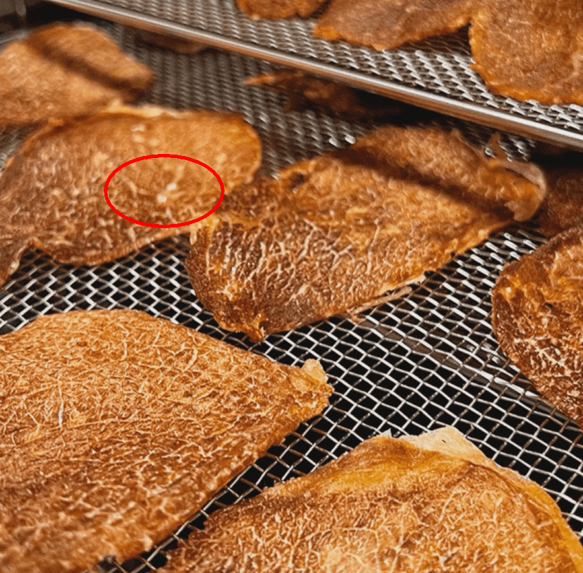 비프칩 제조 후 건조기에서 꺼내면, 소금 중 일부가 아래 이미지처럼 하얗게 되는 부분이 있을 수 있습니다.